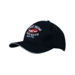 Headwear Professionals Adult Poly Twill Sandwich Cap. Structured 6 panel. Pre-curved peak. Fabric covered short touch strap. Breathable.